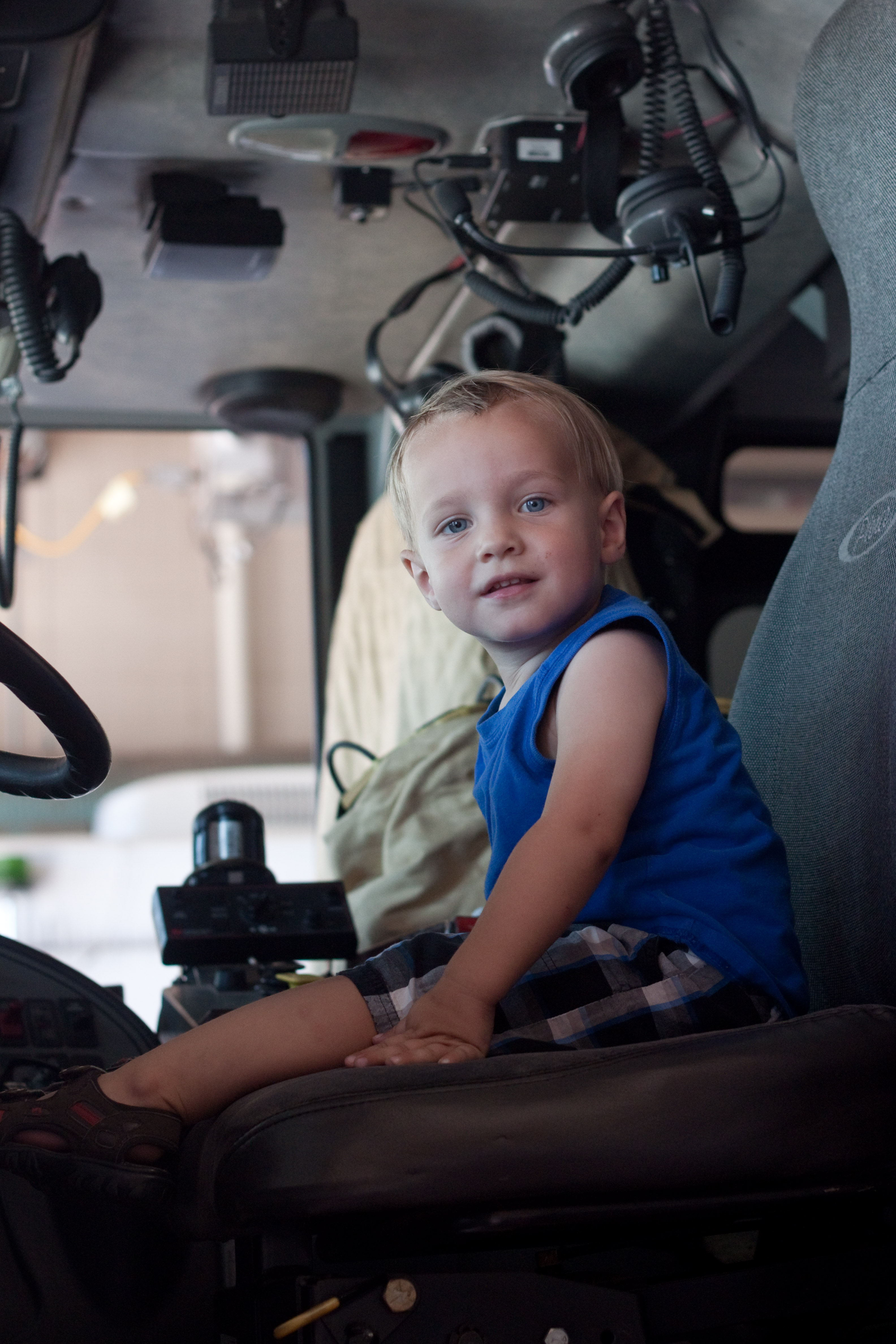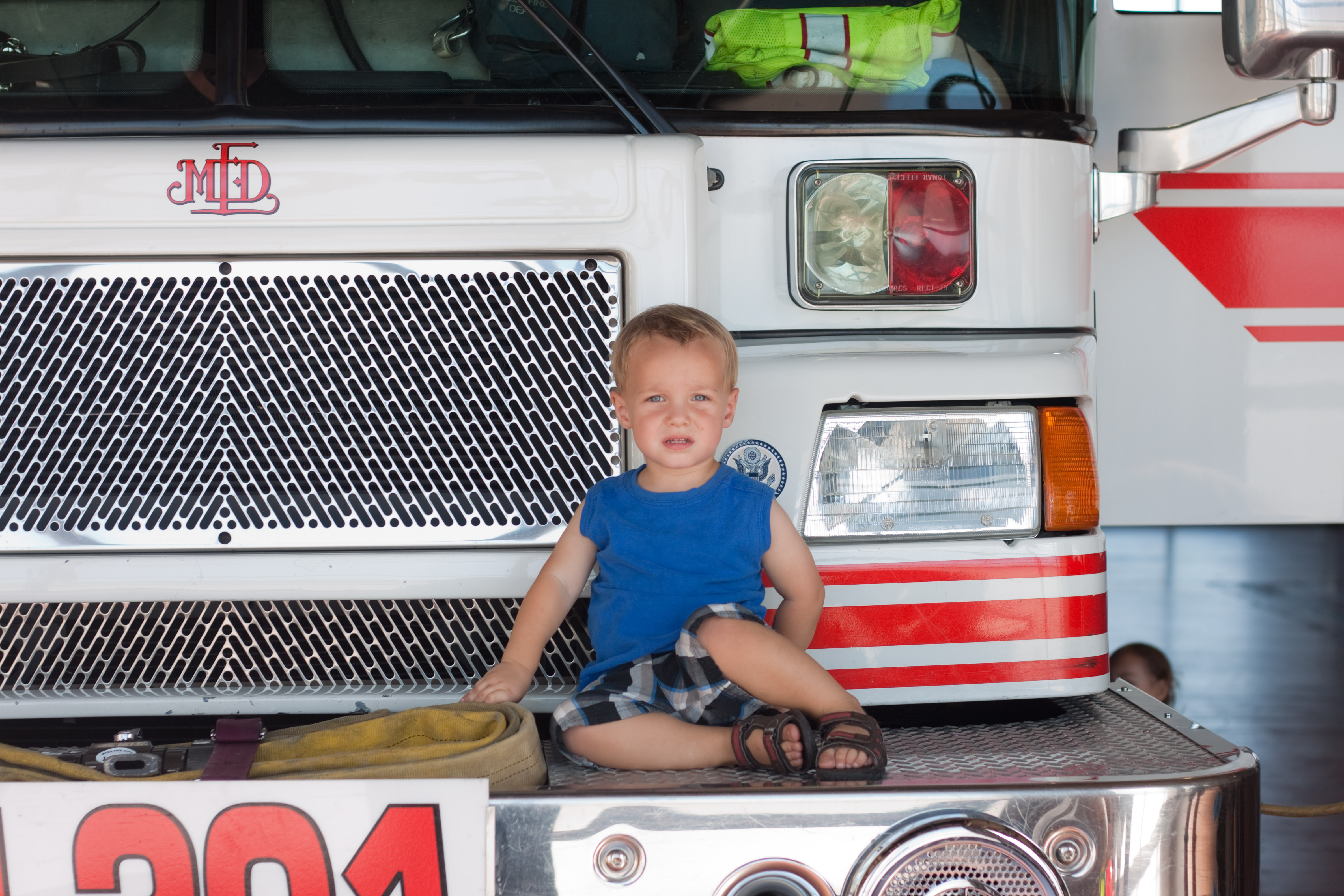 Rondel has a deep and abiding love of firetrucks. As an infant, one of the first imitative sounds he ever made was a firetruck siren (seriously – he was 5 or 6 months old, sitting there with his toys, making siren noises!), and now, if he hears a siren coming, he runs to the big window upstairs, asks to go outside, or (if we are outside) almost frantically tries to get to the nearest road in case it is going to pass by. We live less than a mile from the biggest station in our city, so we hear and see the trucks fairly often, but I wondered if there was a way to see them up close and personal.
