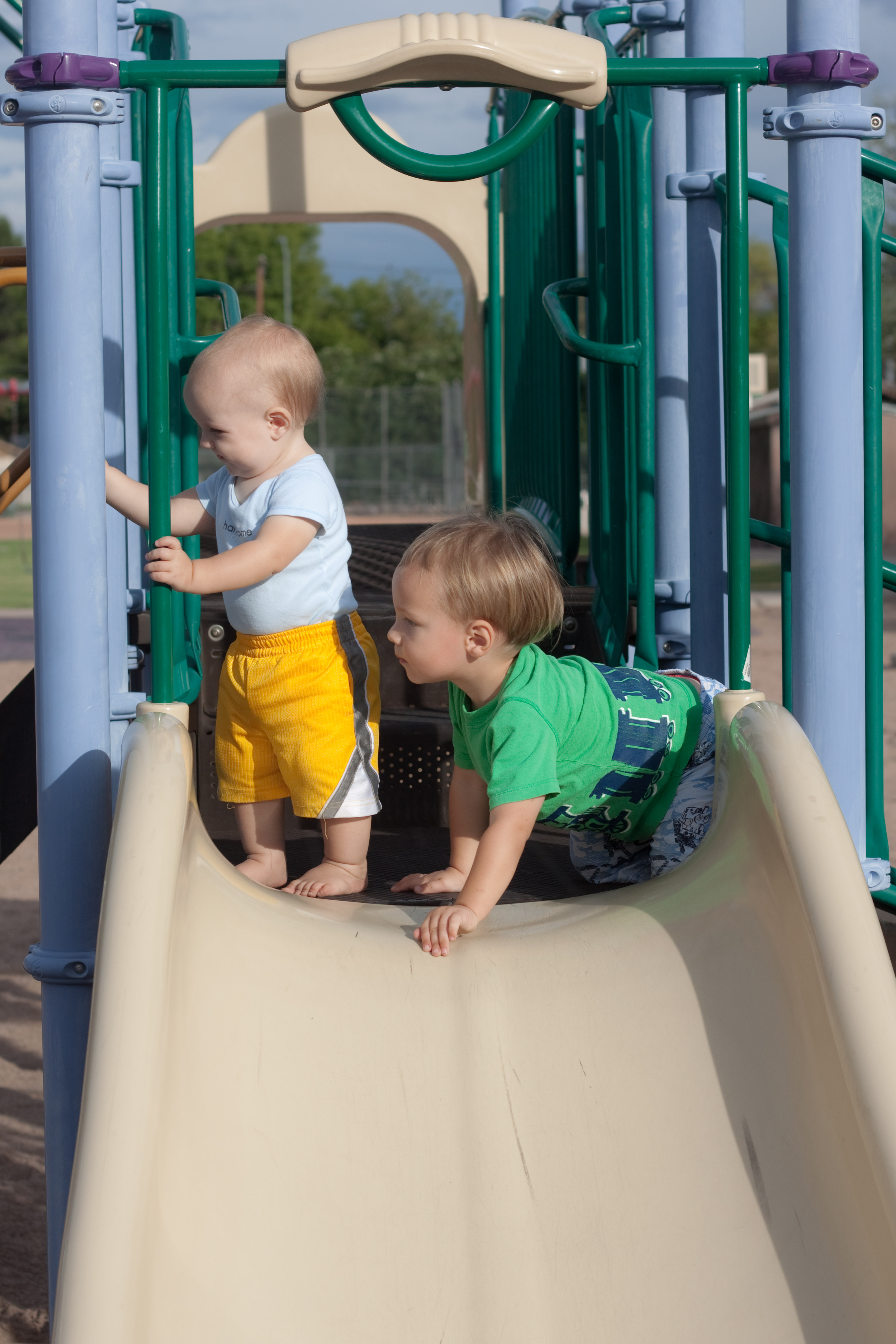 Its hard to tell which pole has his attention – maybe its both. The colors are the most interesting to me but I’m old and poles don’t capture my attention much. Your baby is probably exploring the texture, shape, strength and so many other aspects of the poles. Or, maybe he’s just glad to have something to hang on to while he is standing up!