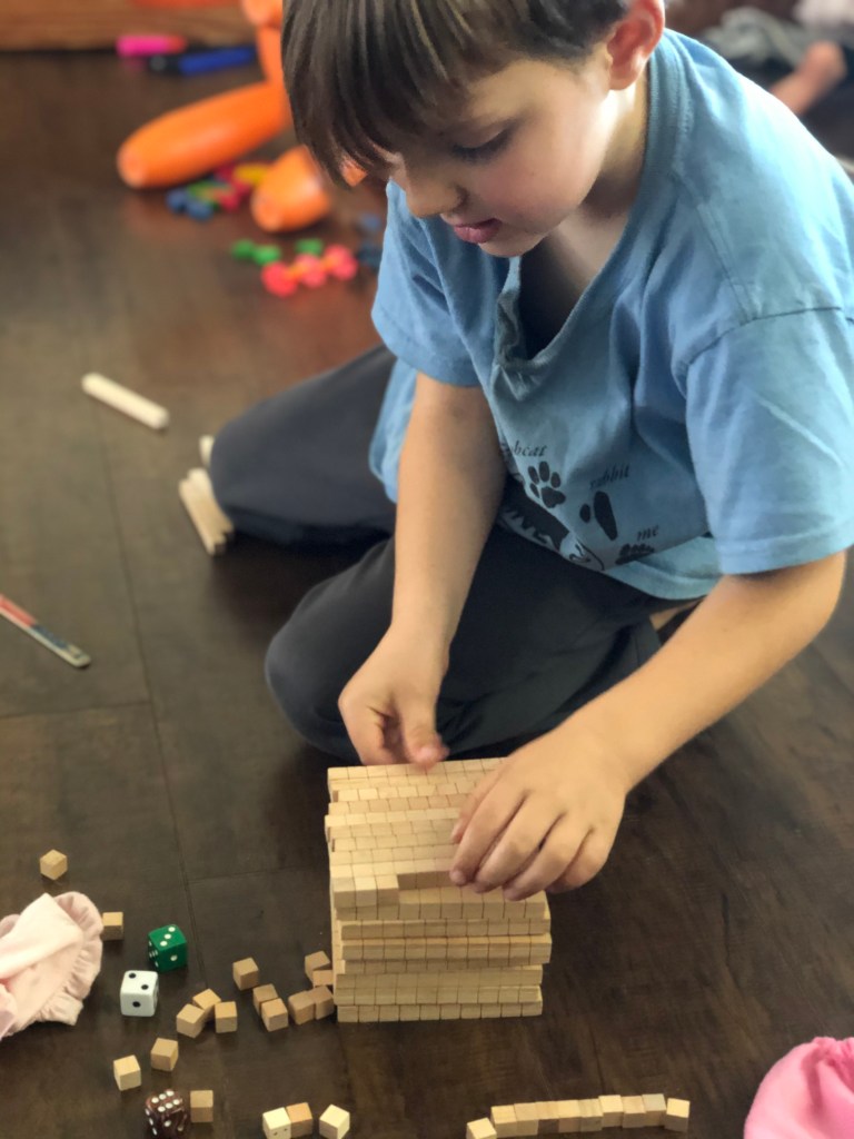 On Rondel’s turn, he rolled four dice and added them all together (which was perfect for him! Adding two dice is easy for him at this point, but four lined up with the addition we’d been encountering in Life of Fred and he remembered and mentioned that.) Seeing how his one’s cubes lined up to form a group of ten, and how his ten’s lines added up to form a hundred square, the concepts of place value finally started to make sense to him! These blocks are such a nice visual/tactile representation of that 🙂