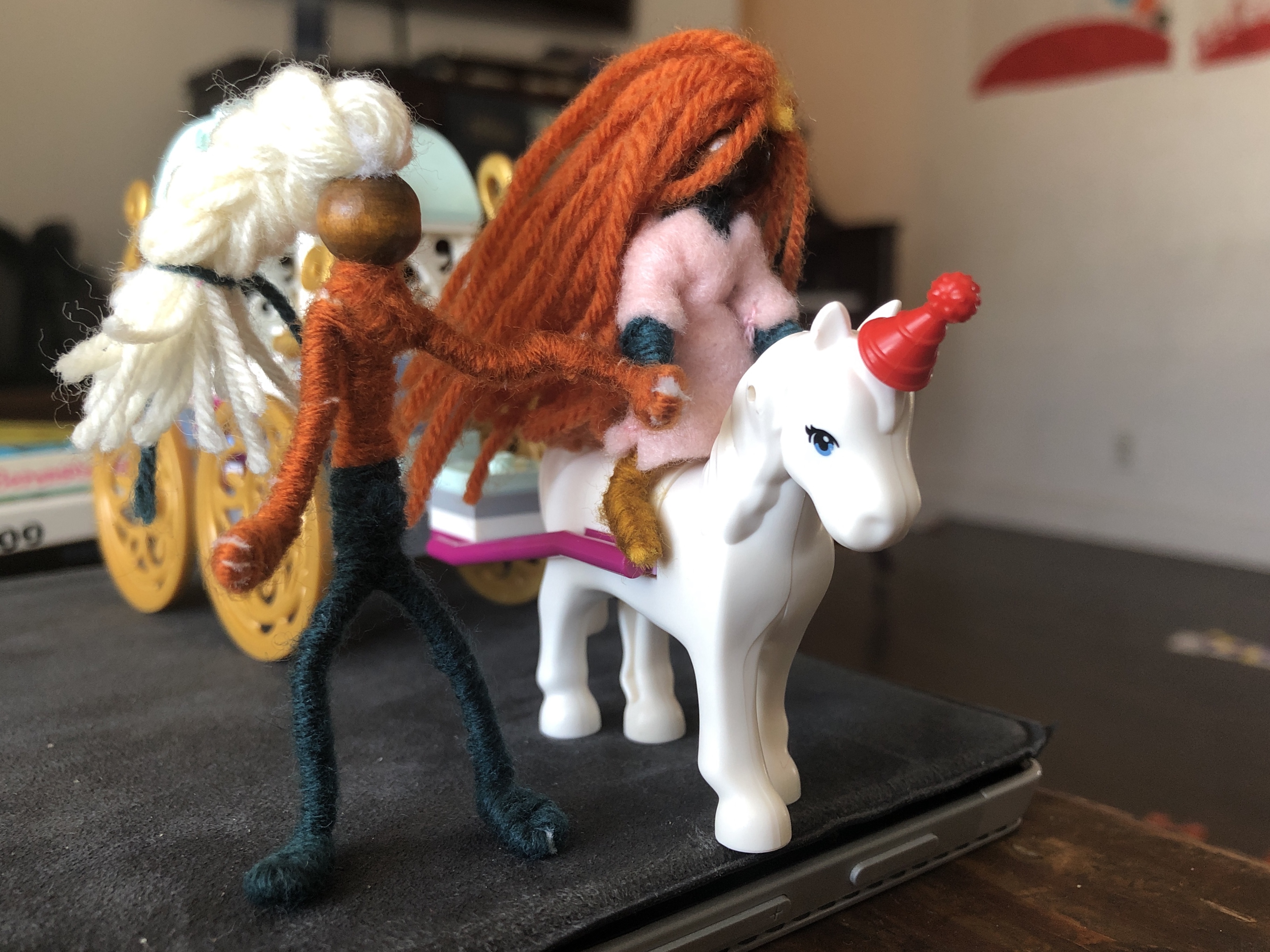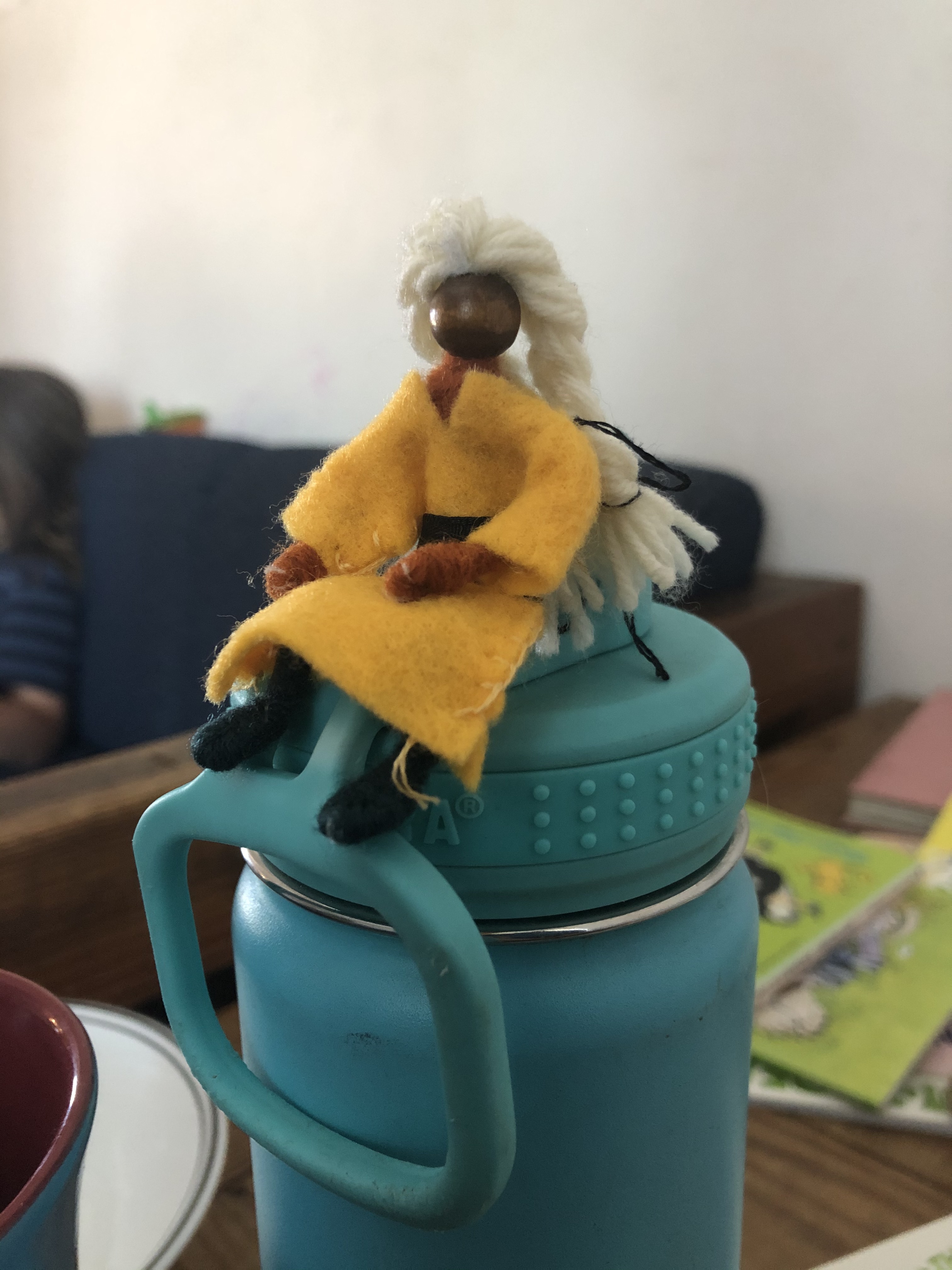 2. So, when we made bendy people earlier this week, it’s not surprising that the first one he requested was a king! (I later made a sword for him as well). Aubade asked for a princess (she is so obsessed with princesses right now), and I also made a grandma for her and an evil queen (not pictured) for Rondel since his king needed an antagonist. I used these instructions from The Enchanted Tree, although the beads I had available for the heads were quite a bit smaller than theirs. While they used embroidery floss for wrapping the dolls’ bodies, I found that yarn worked just as well, as did a strange metallic gold string I have around that is a complete disaster for just about anything else. My sister returned our bag of pipecleaners and my mom is bringing up her hoard of yarn remnants, so I’m expecting a new round of bendy people to join us soon!