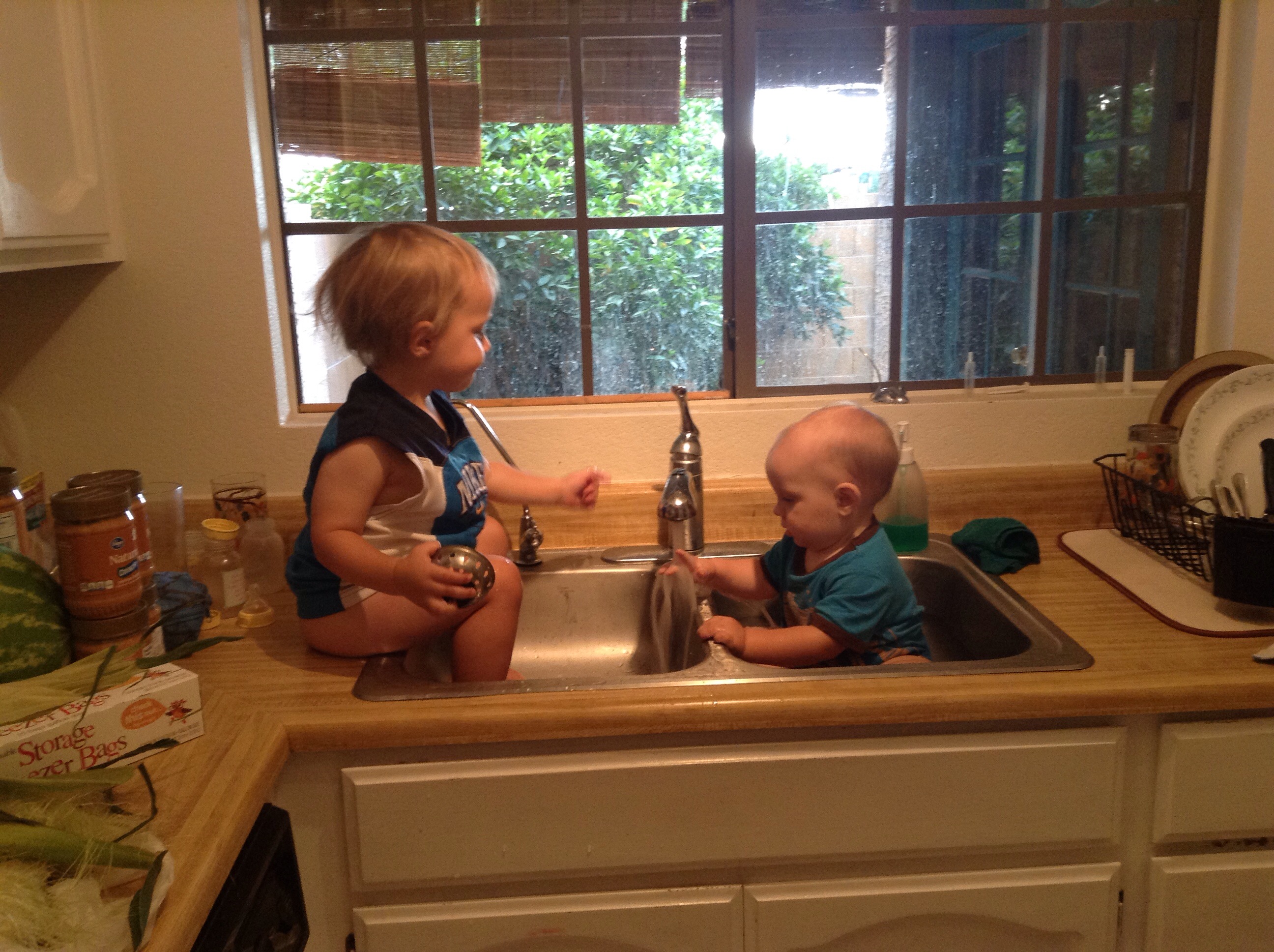 And of course it is still warm enough here to play at the splash pad in the afternoons (and probably in the mornings too, to be honest – our highs are just beginning to flirt with the 90’s when storm fronts come through, and then they jump back up to triple digits). Rather than mourn the lack of any significant autumnal season, we’re choosing to enjoy the summer fun as long as we can. Honestly, too, those late summer storms make this one of my favorite times of year: the nights are sometimes cool enough to leave the windows open, the mornings are fresh and clean-feeling, the days are softly warm and perfect for water play, and in the evenings the great dark clouds roll in with thunder and pouring rain.