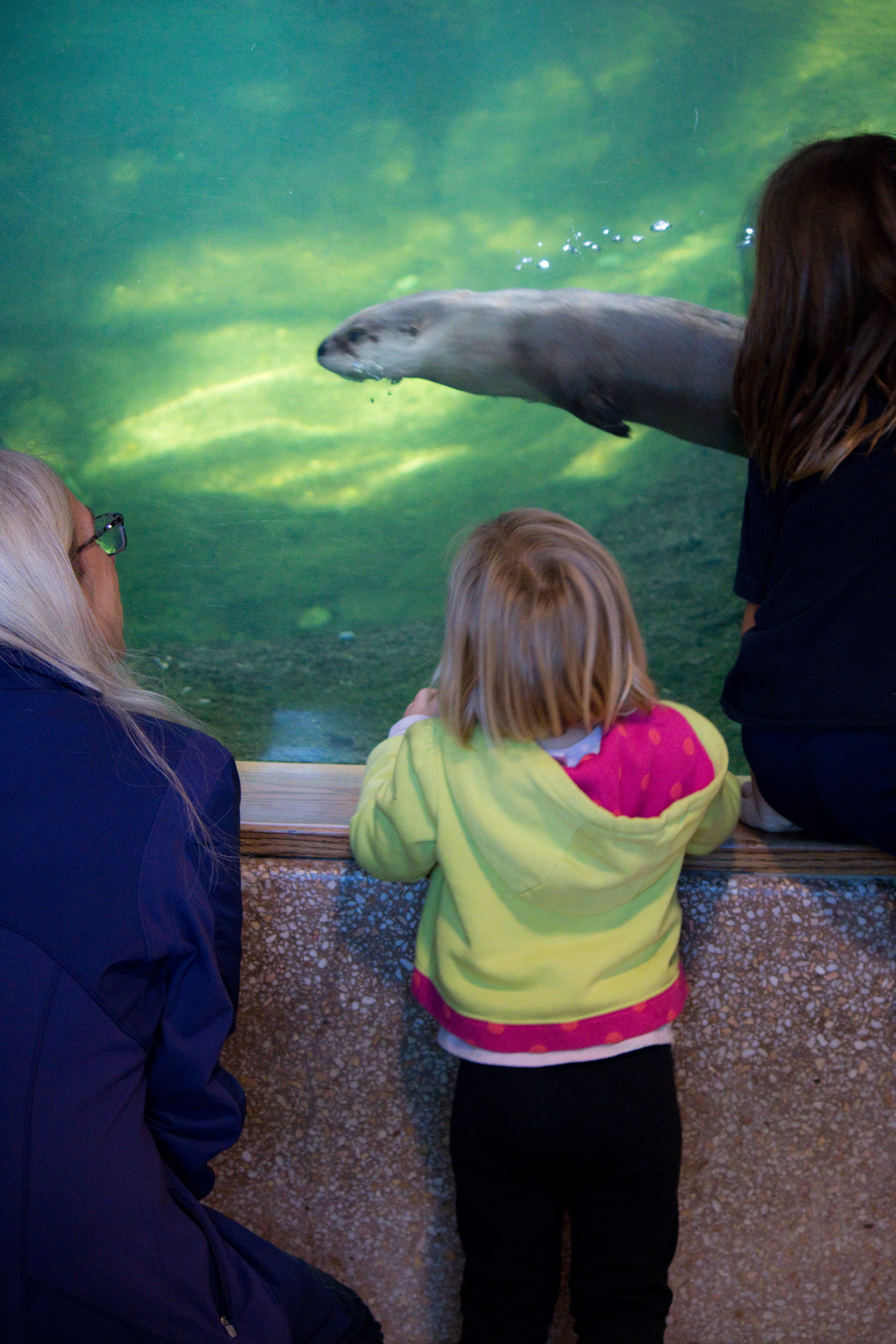 - The Animal Exhibits – The exhibits here recreate the natural desert environment, and can often be viewed from multiple levels. All the riparian animals have underwater viewing areas, for example, and cliff-dwelling animals like the ocelot can be seen from two different vantage points. We saw a beaver curled up in his den, and a playful river otter swam around by the window for a long time with Aubade and Limerick. He would swim right up to the glass and around in circles and back again; Aubade kept jumping back giggling saying that he almost touched her and Limerick kept trying to explain to her that the otter couldn’t actually touch her because there was a glass wall in the way 😛