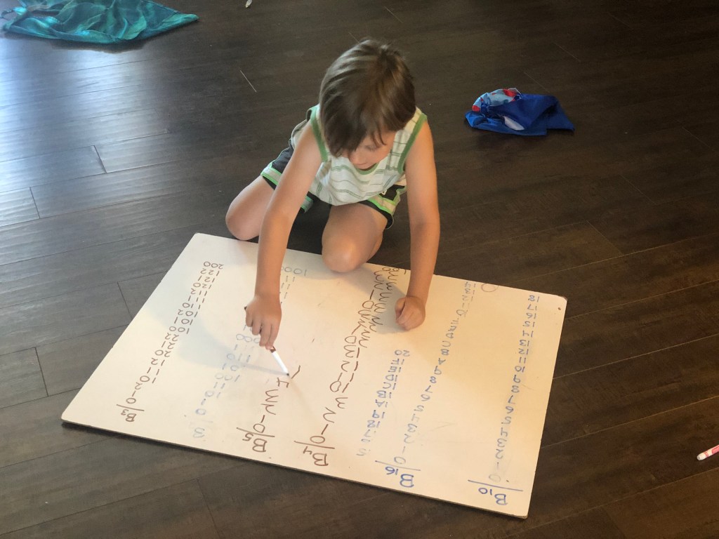 It’s binary! Assigning each finger one place in the binary place value system, he figured out how to count on his fingers to 1023 (which would be all fingers extended). In addition to showing how natural this aspect of mathematics is to him, it also shows a good foundational understanding of computer science – because electric signals are either on or off, just like Limerick’s fingers could either be extended or curled down, and therefore represent data in this same bitwise manner. It is so amazing what kids can think of and create when they are given the chance to deeply explore something they love.