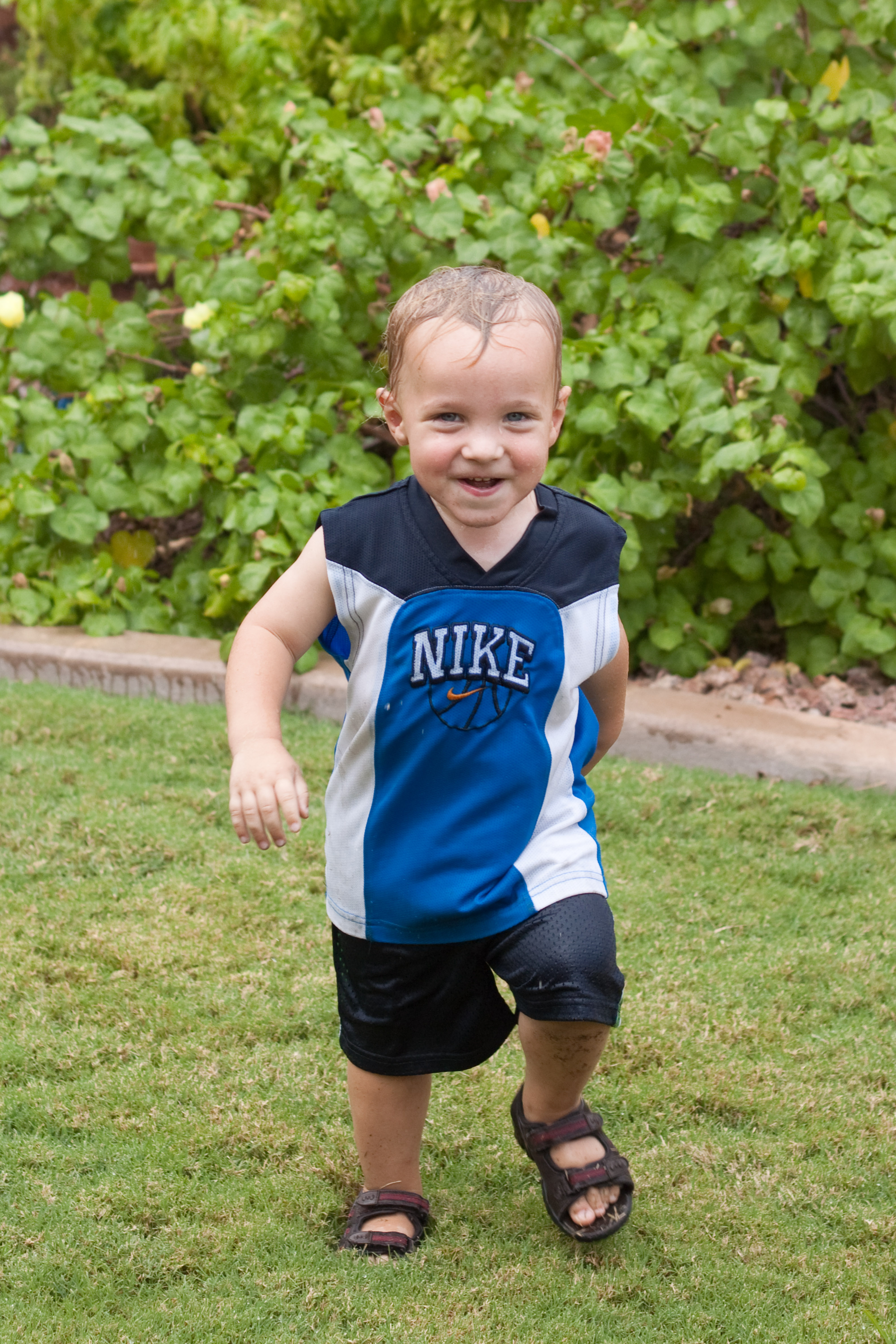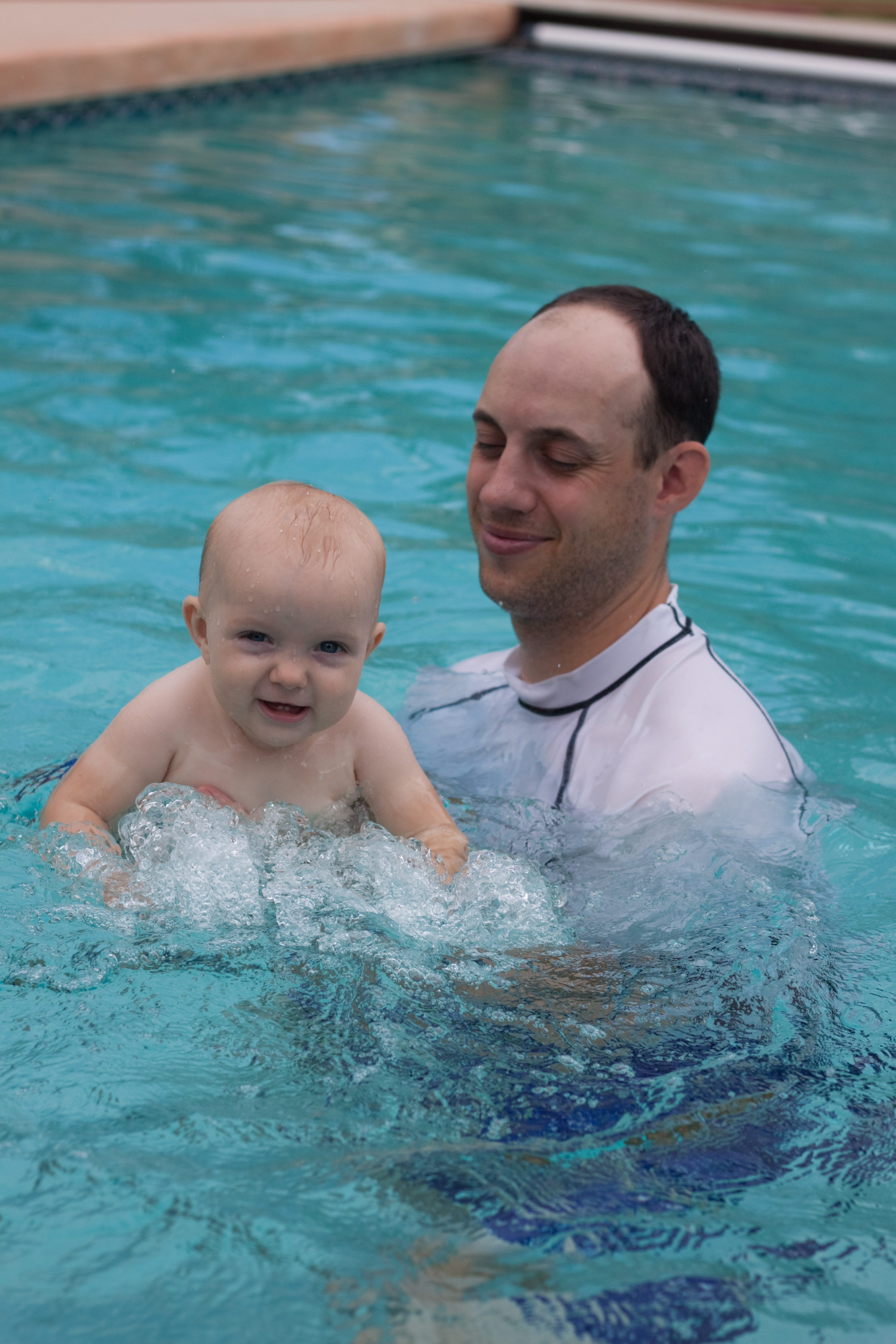 I love the look on this kid’s face! And he loves jumping into the pool (actually, he likes to hold your hands and kind of step in off the side into the water… he did jump all by himself with both feet a few times though!) – and swimming in the pool, and knocking Daddy down in the pool, and pretty much everything to do with the pool.